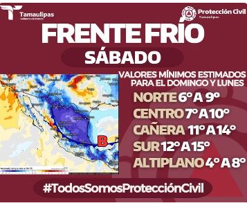 Así, en la zona norte de Tamaulipas la temperatura se situaría a partir del sábado entre los 6 y 9 grados Centígrados.