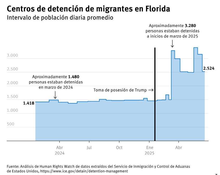 El número de personas detenidas por el ICE en Florida también ha aumentado por cuenta de las políticas federales y estatales que han ampliado el alcance de la aplicación de la ley de migración. En Krome, la población detenida se triplicó en los tres primeros meses de 2025 y superaba en casi tres veces la capacidad de funcionamiento del centro de detención. El FDC, una cárcel federal que en los últimos años no se había utilizado para la detención de migrantes, comenzó a albergar a cientos de migrantes en febrero.