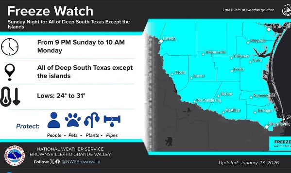 Brownsville, Texas.- El Servicio Meteorológico Nacional ha emitido una alerta de helada desde las 9:00 p. m. del domingo hasta las 10:00 a. m. del lunes 26 de enero. También ha emitido un aviso de frío extremo desde las 3:00 a. m. del domingo hasta las 8:00 a. m. del lunes. Advierten que se espera una sensación térmica peligrosamente baja que podria provocar hipotermia.