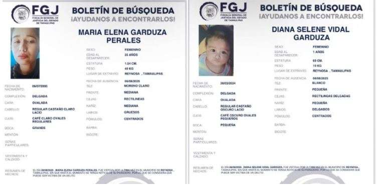 La Comisión Estatal de Búsqueda para Personas Desaparecidas en Tamaulipas difundió ayer la ficha de la madre, María Elena Garduza Peralta y la niña de un año, Diana Selene Vidal Garduza, pero se desconocen las razones por las que omitió al menor de siete años, Eli Abdiel Vidal Garduza, que segun el colectivo tambien esta desaparecido.