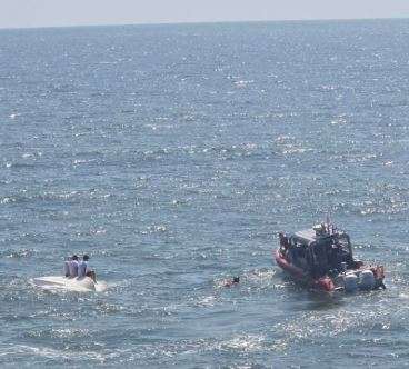 Una vez en el lugar, las tripulaciones aéreas y marítimas localizaron a las personas sentadas en la embarcación volcada. La tripulación aérea bajó a su nadador de rescate, quien ayudó a los navegantes a subir a la embarcación de la Guardia Costera.