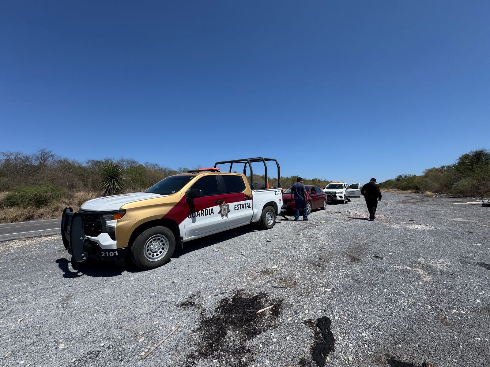 Abasolo, Tamaulipas.- Personal de la Guardia Estatal brindó apoyo a un automovilista que quedó varado sobre la Carretera Estatal 75, en el tramo Villa de Casas–Soto la Marina, como parte del Operativo Carretera Segura.