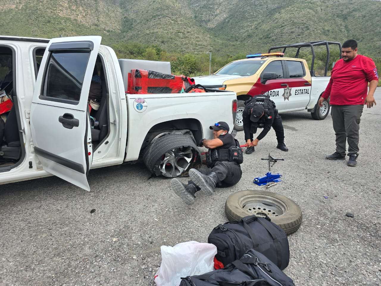 Jaumave, Tamaulipas.- En el marco del Operativo Invierno Seguro Héroes Paisanos 2025 personal de la Guardia Estatal comisionado a la estación Segura Jaumave auxilió a un connacional que, en su retorno al país tras una estadía laboral en Estados Unidos presentó una afectación en un neumático a la altura del kilómetro 100 de la Carretera Federal 101.