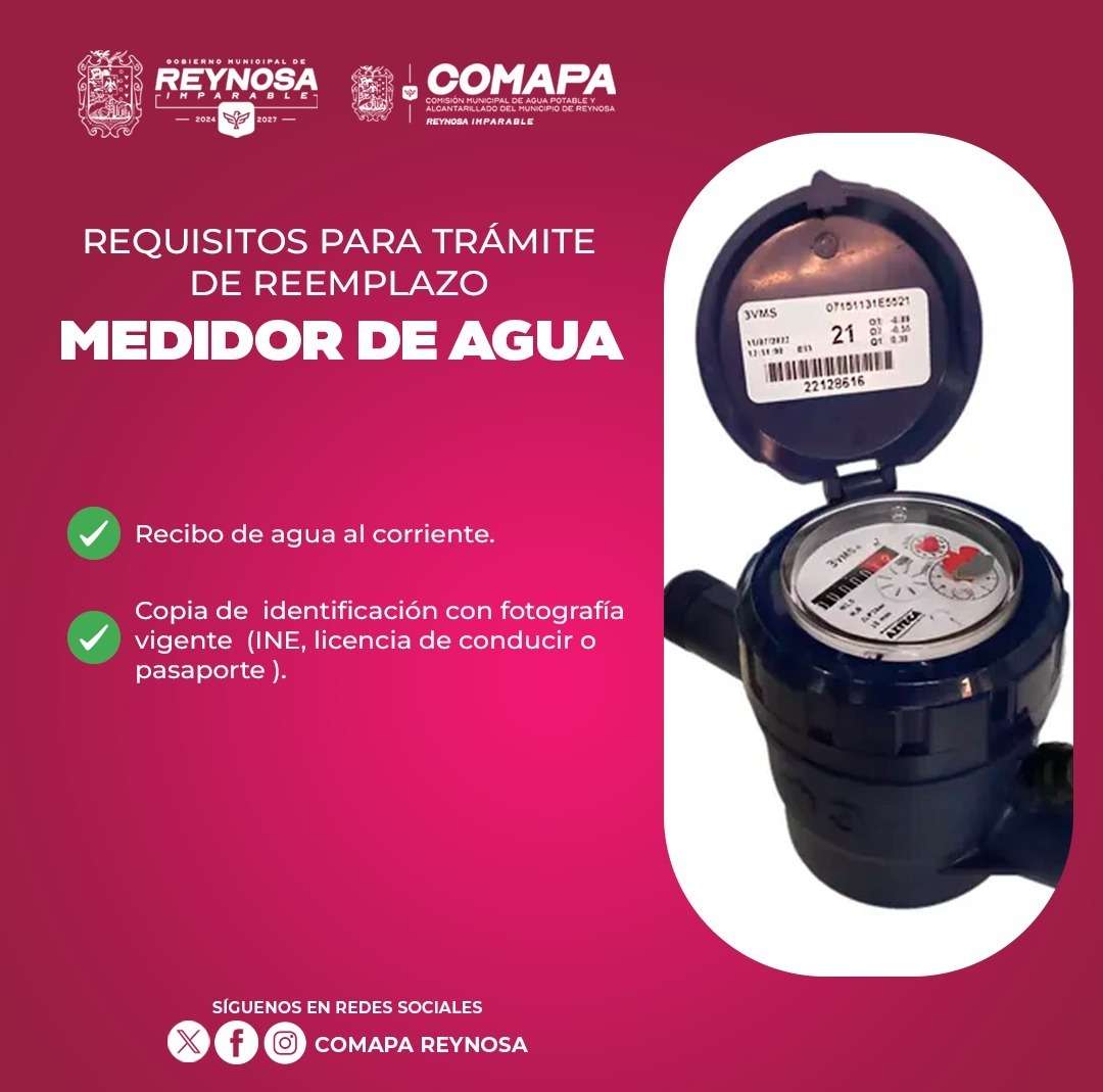 Reynosa, Tam.- La Comisión Municipal de Agua Potable y Alcantarillado de Reynosa invita a los usuarios que cuentan con medidor dañado o en mal estado a realizar el trámite correspondiente para su reemplazo. Esto se puede hacer en las oficinas del organismo en la sucursal matriz, de la colonia Longoria, en un horario de lunes a viernes de 8:00 A.M. a 4:00 P.M.