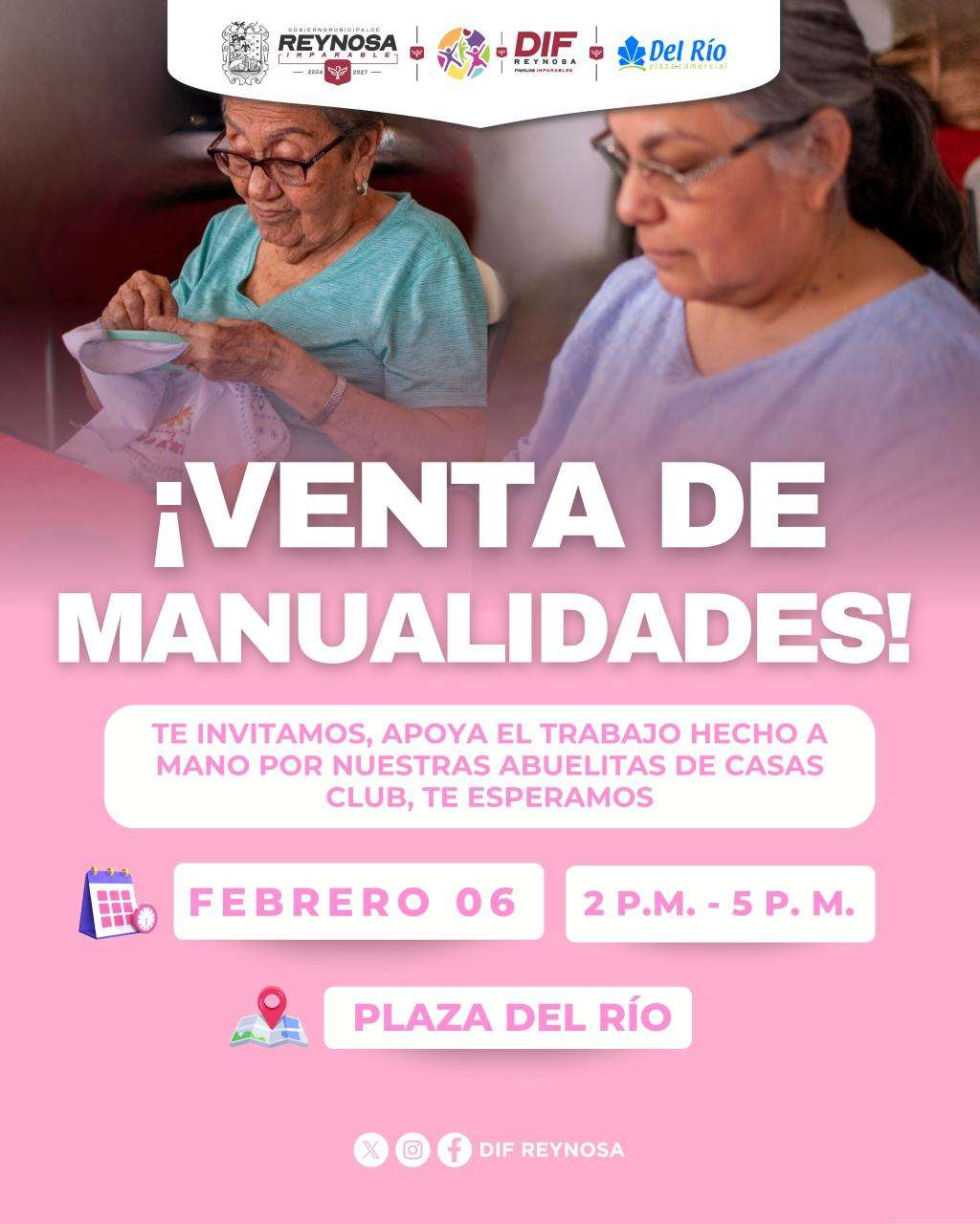 Reynosa, Tam.- Con el fin de apoyar el talento y la creatividad de las abuelitas que forman parte de las Casas Club, el Sistema DIF-Reynosa que preside Carlos Luis Peña Garza, invita a la ciudadanía a apoyar la venta de manualidades que se llevará a cabo hoy viernes 06 de febrero en el Centro comercial Plaza del Río.