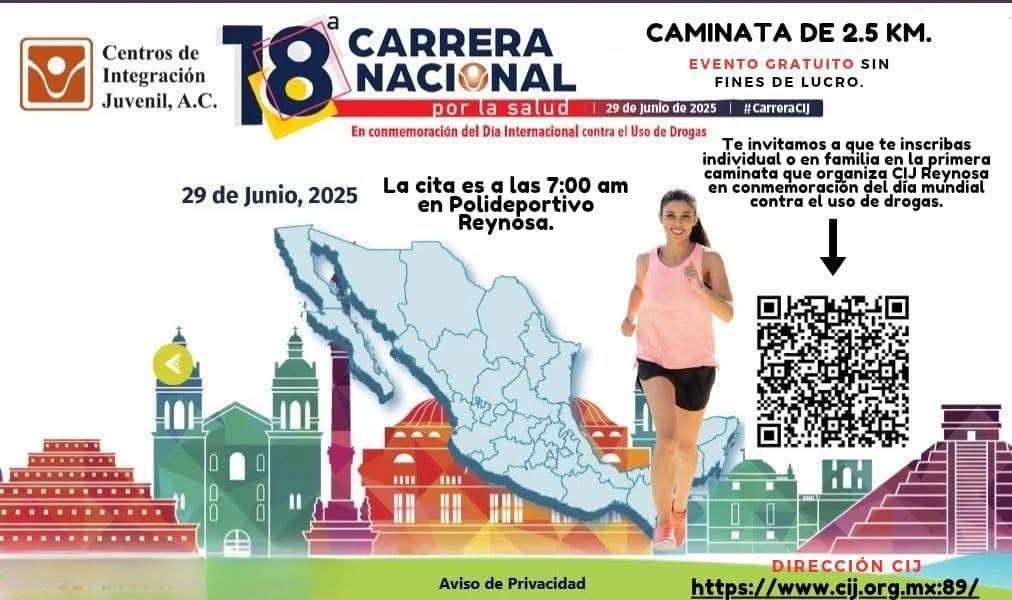 Reynosa, Tam.- Reynosa invita a toda la ciudadanía para inscribirse y participar en la 18ª Carrera Nacional por la Salud, organizada por el Centro de Integración Juvenil A.C. la cual se llevará a cabo este domingo 29 de junio a las 7:00 de la mañana .