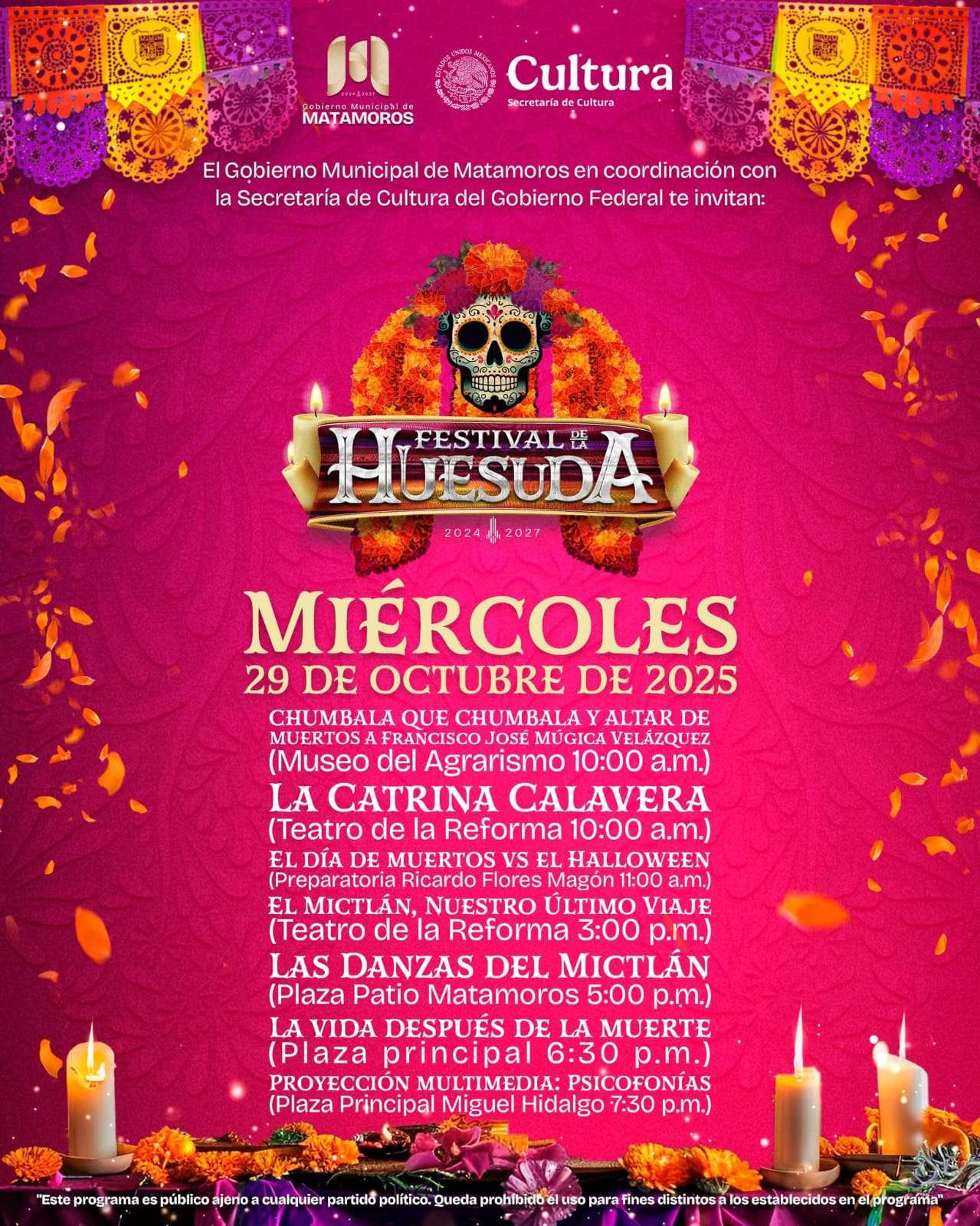 H. Matamoros, Tamaulipas.- Matamoros continúa viviendo con entusiasmo el Festival de la Huesuda 2025, una celebración que envuelve a la ciudad con el brillo de las velas, el aroma del cempasúchil y el arte en cada rincón. En el marco de esta colorida festividad, el Gobierno de Beto Granados invita a la ciudadanía a disfrutar de una jornada especial este miércoles 29 de octubre, llena de actividades que rinden homenaje a la vida, la memoria y nuestras tradiciones mexicanas.
