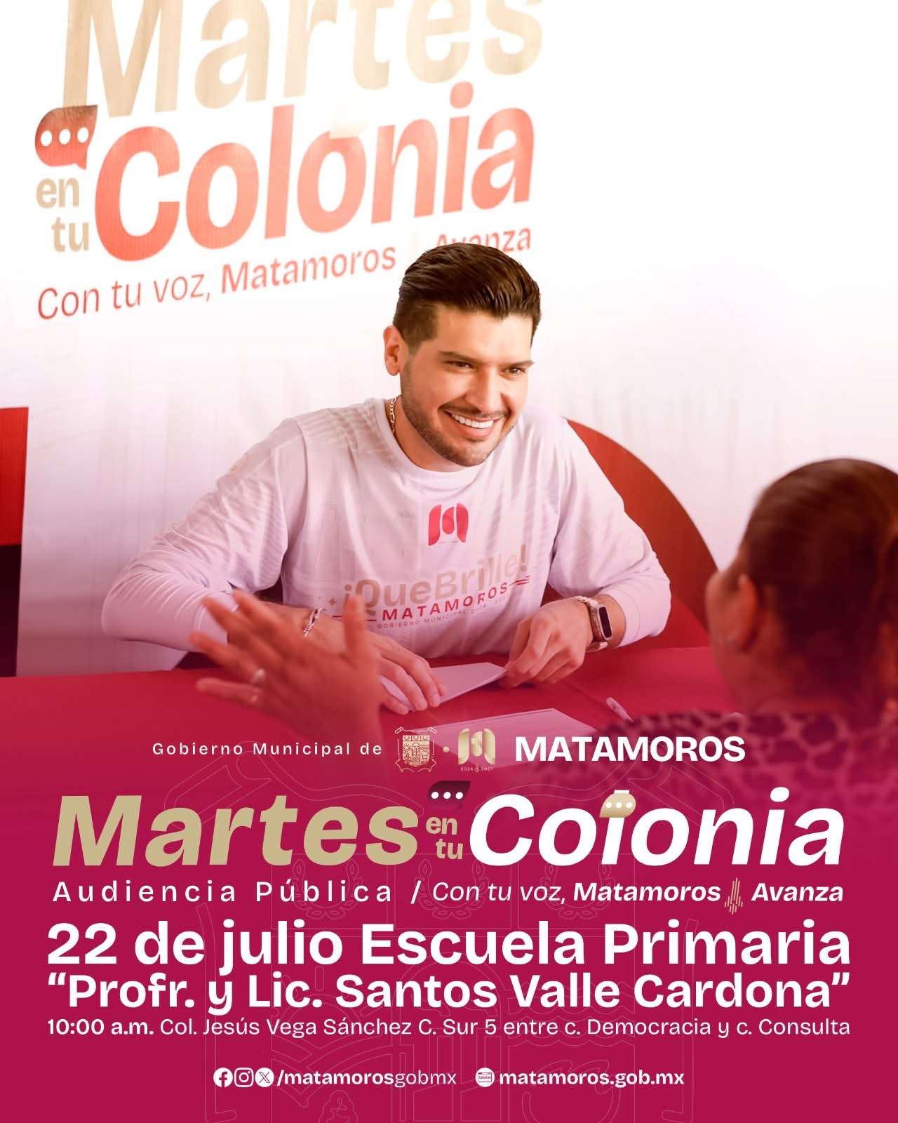 H. Matamoros, Tamaulipas.- Este martes 22 de julio, el Gobierno de Matamoros llevará la audiencia pública “Martes en tu Colonia” a la Escuela Primaria “Profr. y Lic. Santos Valle Cardona”, ubicada en la Colonia Jesús Vega Sánchez.