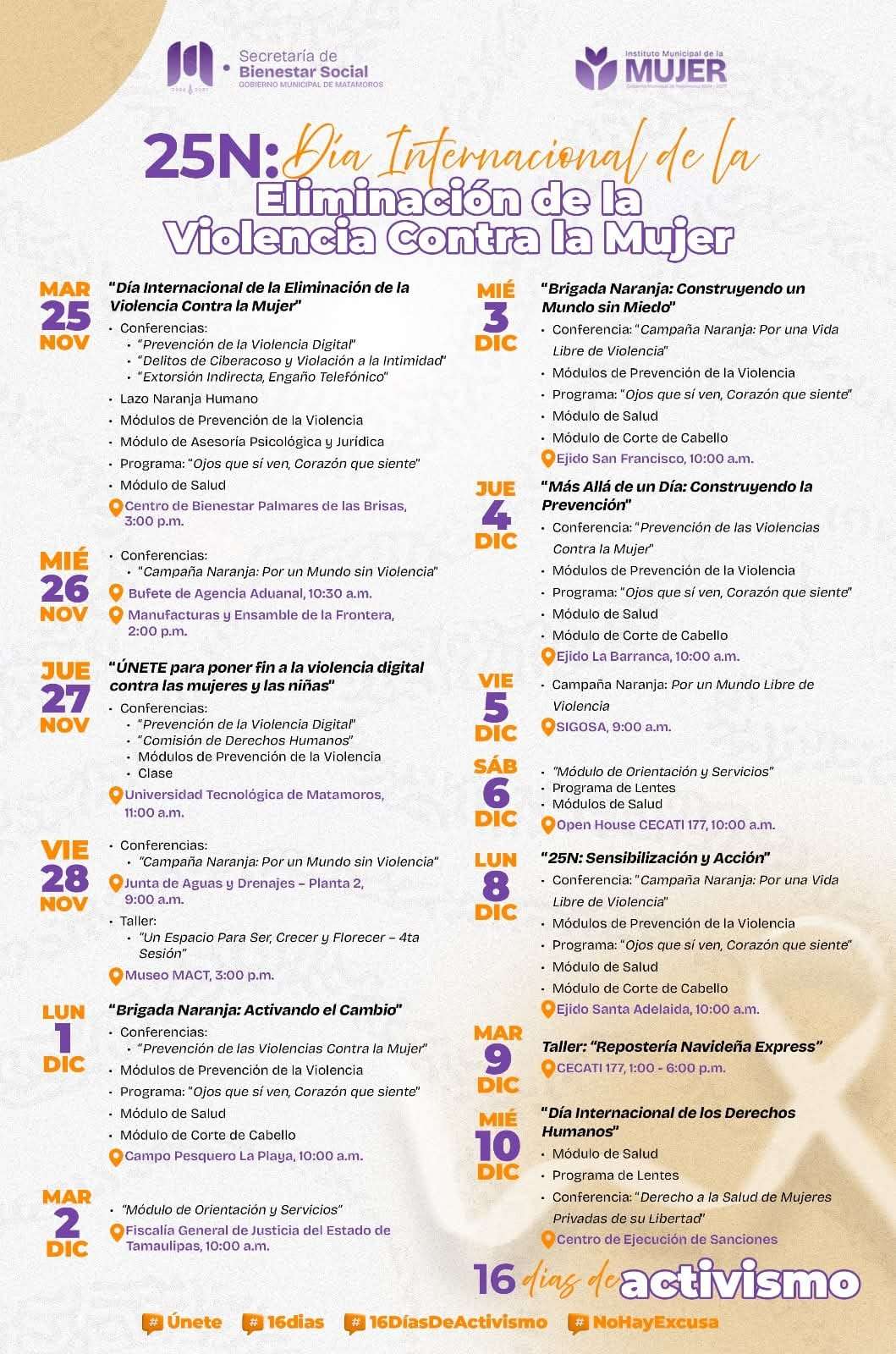 Matamoros, Tam.- El Gobierno de Matamoros, encabezado por Beto Granados, se sumó oficialmente a la campaña internacional de los 16 Días de Activismo contra la Violencia hacia las Mujeres, una iniciativa que busca visibilizar, prevenir y erradicar todo tipo de agresiones hacia niñas, adolescentes y mujeres. Con este esfuerzo, la administración municipal reafirma su compromiso con la construcción de una ciudad más segura, igualitaria y libre de violencia.