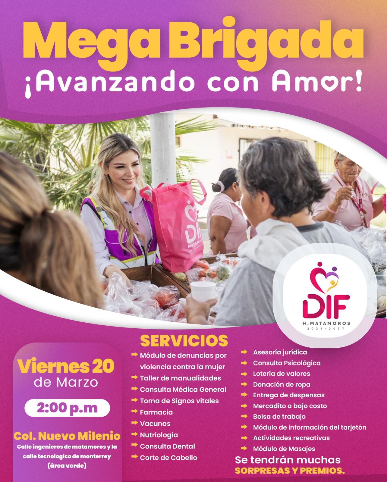 Matamoros, Tam.- El Gobierno Municipal y el Sistema DIF Matamoros, en coordinación con el Instituto de la Mujer, la Secretaría de Bienestar Social y el IMSS, extiende una cordial invitación a la ciudadanía para asistir y beneficiarse con la Mega Brigada que se llevará a cabo en la colonia Nuevo Milenio. Esta iniciativa tiene como propósito acercar servicios de asistencia social que fomenten la atención directa, el bienestar integral y el cuidado de la salud de las familias.