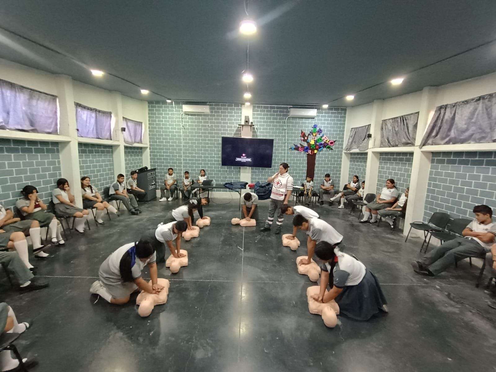 Durante la primera semana se abordó el tema Introducción a los Primeros Auxilios. En la segunda semana, se capacitó a las y los alumnos en la práctica de la maniobra de Heimlich y Reanimación Cardiopulmonar (RCP). Para la tercera semana se tiene previsto el tema Atención de Heridas y Fracturas, y se concluirá durante la cuarta semana con pláticas sobre Apoyo Psicosocial y Respuesta en Situaciones de Emergencia.