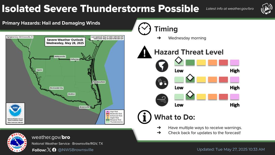 Brownsville, Texas.- En los últimos minutos de este martes o principios del miércoles se pronostica la formación de tormentas eléctricas con posibilidad de granizo de más de 2.5 centímetros de diámetro y sin descartar la formación de un tornado aislado.