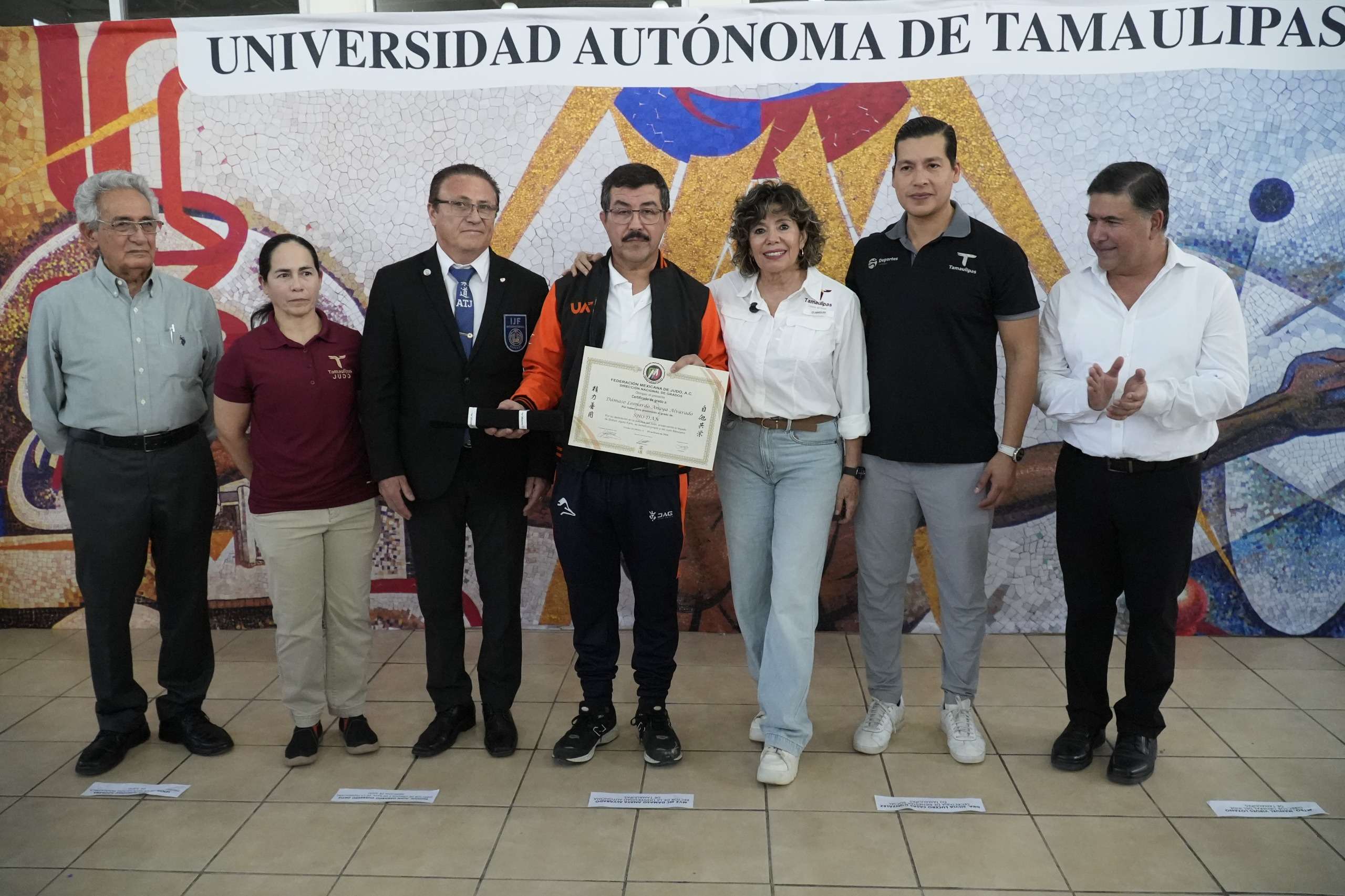 La entrega de esta distinción estuvo a cargo del Shihan Juan Gerardo Guerrero Ortiz, director de Grados y de Kata de la Federación Mexicana de Judo, en el marco de la eliminatoria de judo en su etapa “Estatal CONADE 2026” desarrollada en el Gimnasio Universitario del Campus Victoria, con la presencia de la secretaria de Bienestar Social de Tamaulipas, Silvia Casas González.