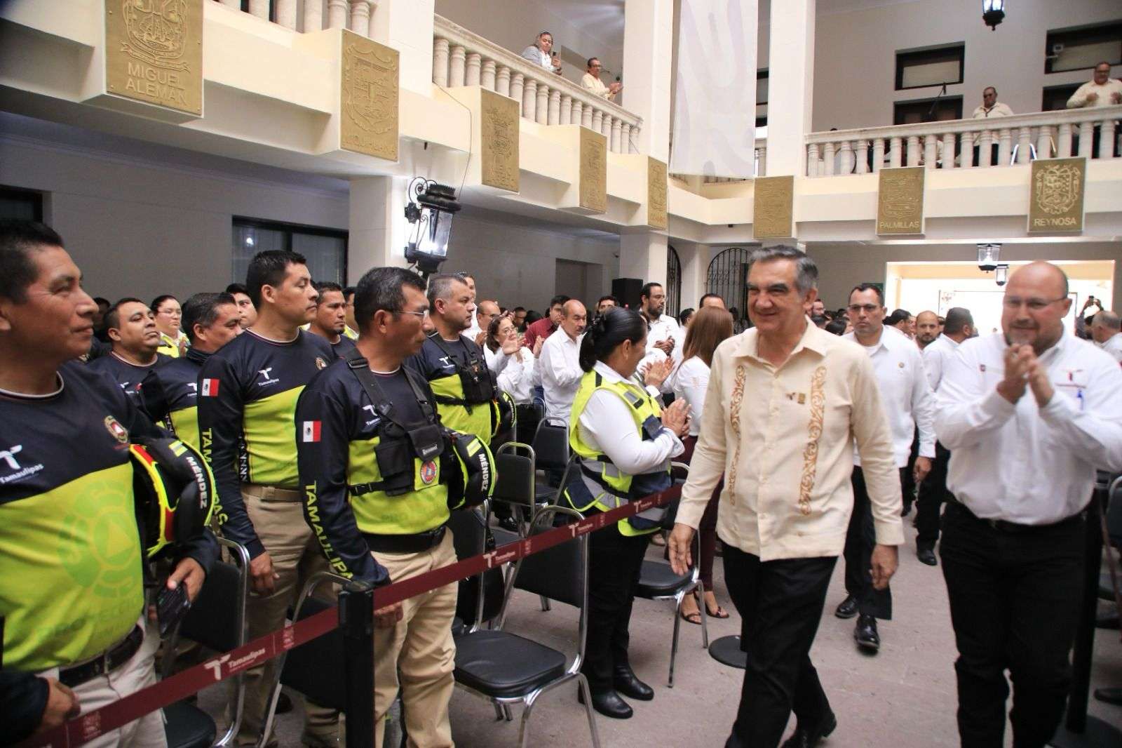 Tras la proyección de un video donde la directora de Protección Civil de Veracruz, Guadalupe Osorno, a nombre de la gobernadora Rocío Nahle da un reconocimiento al pueblo de Tamaulipas, por las labores de auxilio prestadas, el mandatario entregó litografías enviadas por la gobernadora al capitán Marcelo Israel Peña y al técnico auxiliar Fidel Eduardo Castro.