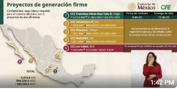 En la conferencia, la directora general de la CFE, Emilia Calleja Alor, dio a conocer que ya se desarrollan trabajos de ingeniería básica y de detalle para iniciar obras en las CCC de Altamira, Tamaulipas, en donde se invertirán 15 mil 38.5 mdp.