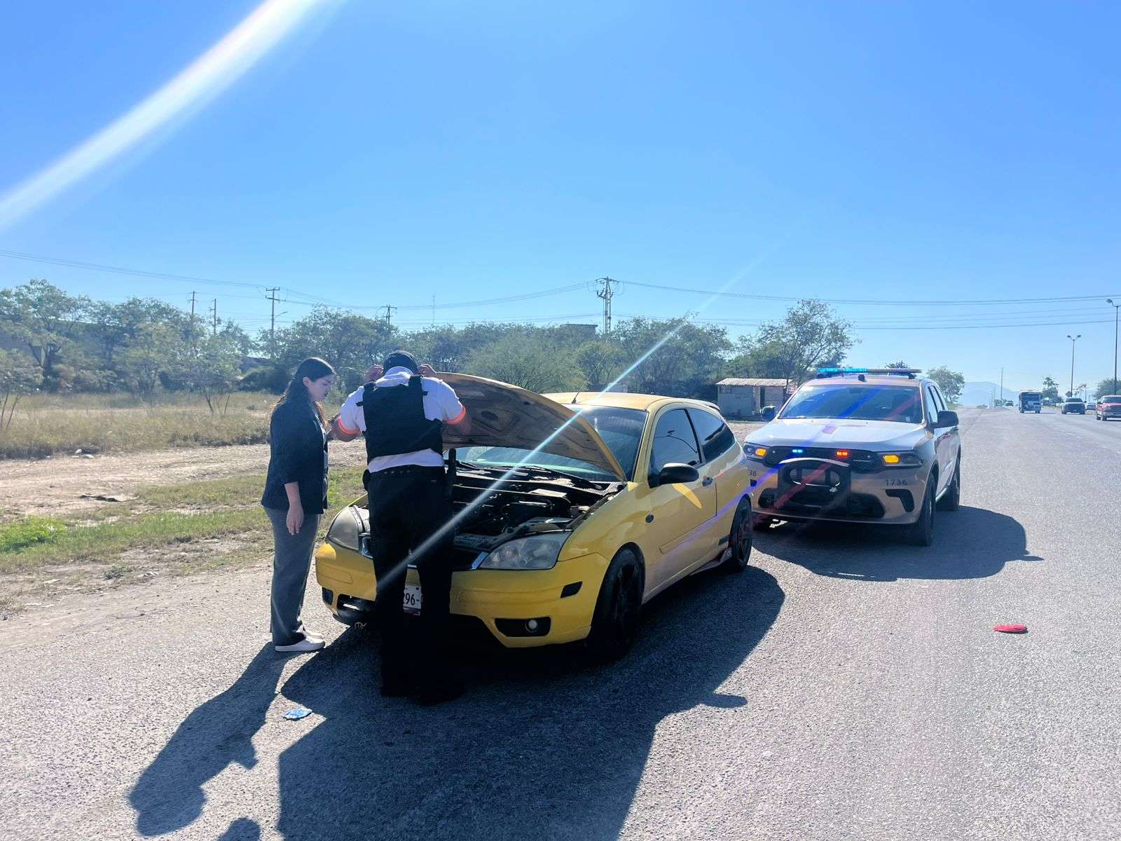 Durante recorridos de seguridad y vigilancia, observaron un automóvil Ford Focus modelo 2009 en la entrada del fraccionamiento Marte R. Gómez, cuya conductora informó que la unidad presentaba una falla mecánica por la ruptura de la banda, y que se encontraba en espera de su mecánico.