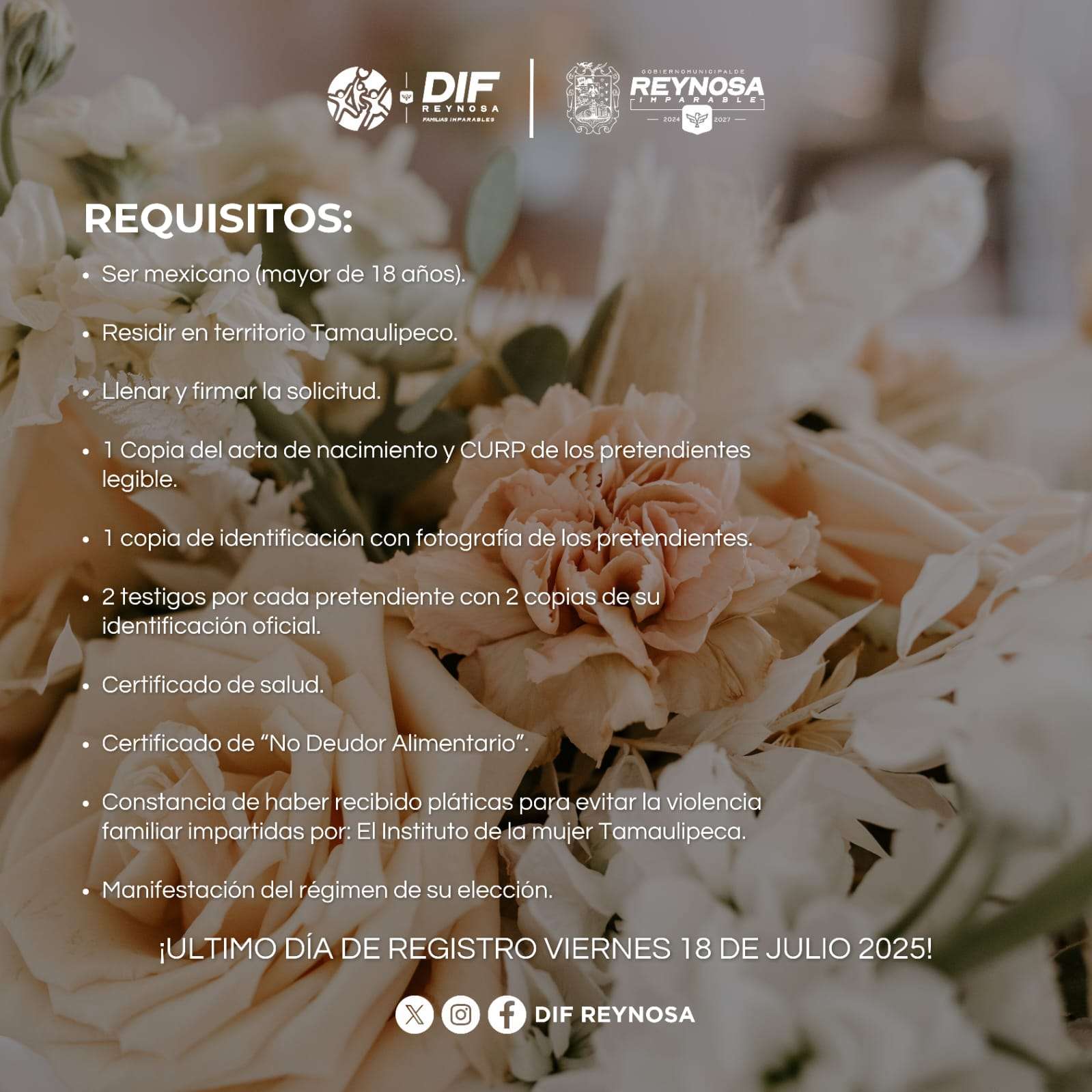 Reynosa, Tam.- El DIF Reynosa invitó a los reynosenses a participar en la convocatoria de Matrimonios Colectivos 2025.